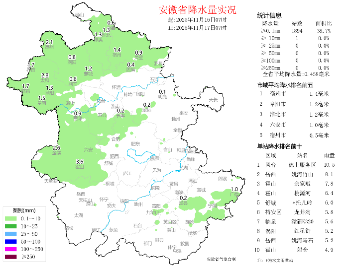 降水预报:今天淮河以北部分地区和淮河以南有降水,其中淮河以北西南部、大别山区、皖南山区有雨夹雪或雪,大别山区局部冻雨。18日后全省以晴到多云天气为主。