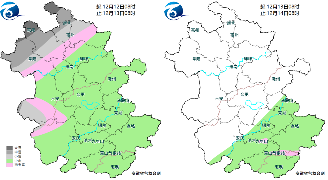 12日(周五):全省阴天有小雨,其中淮河以北大部分地区和大别山区转雨夹雪或小到中雪,局部大雪。