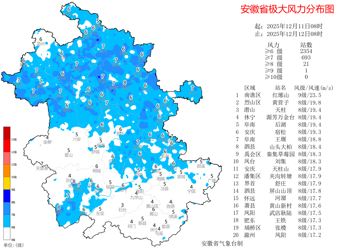 据安徽气象消息,昨天全省多云转阴天,沿江江北有21个站出现8级以上阵风,最大滁州南谯区红琊山23.5米/秒(9级)。今天全省有小雨,其中淮河以北大部分地区和大别山区转雨夹雪或小到中雪,局部大雪;13日沿江江南有小雨,高海拔山区有雨夹雪或小雪;20日前后我省有一次降水过程;其他时段全省以晴到多云天气为主。