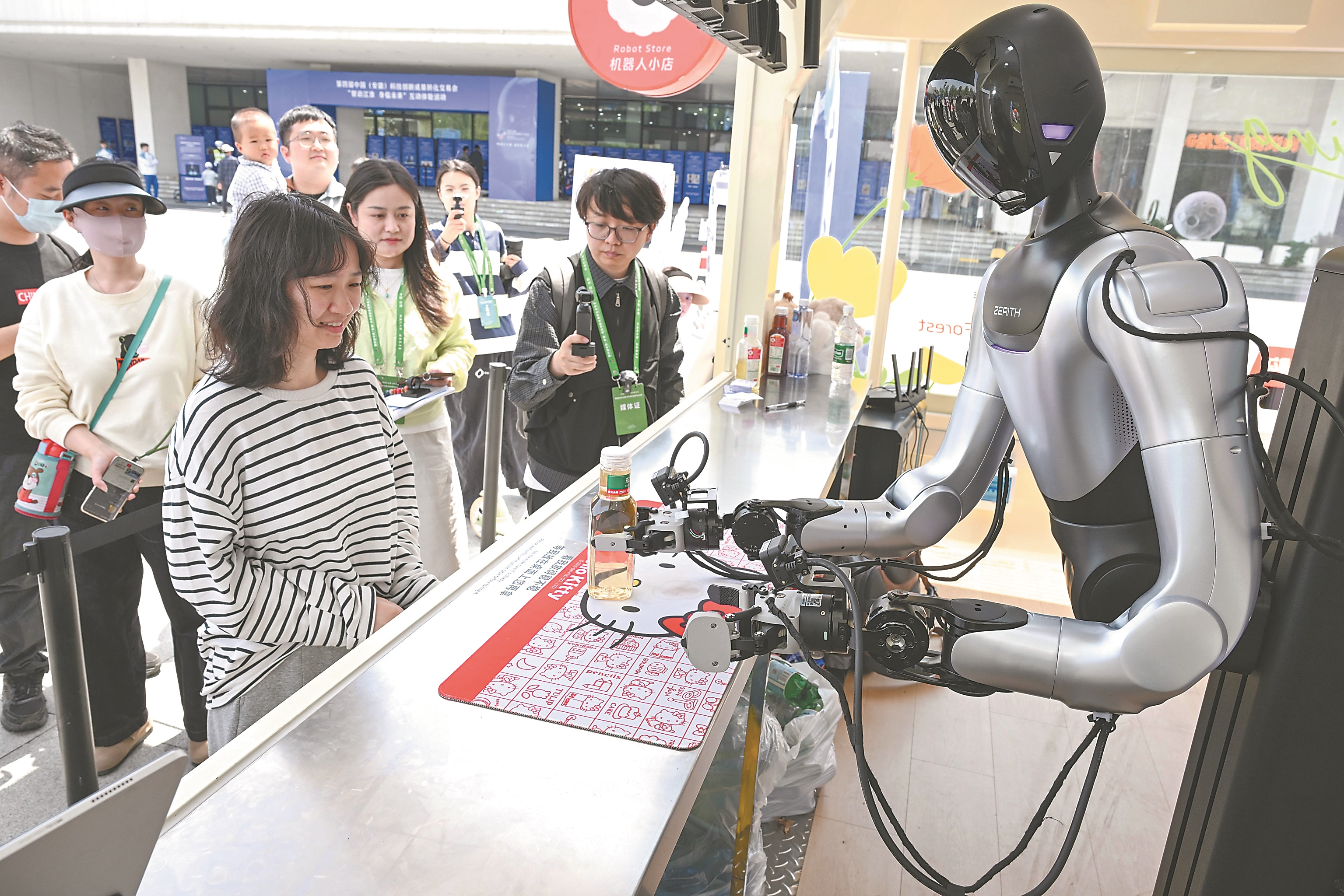 在第四届科交会上,机器人小店给市民送来他们选购的饮料。本报记者 徐旻昊 摄