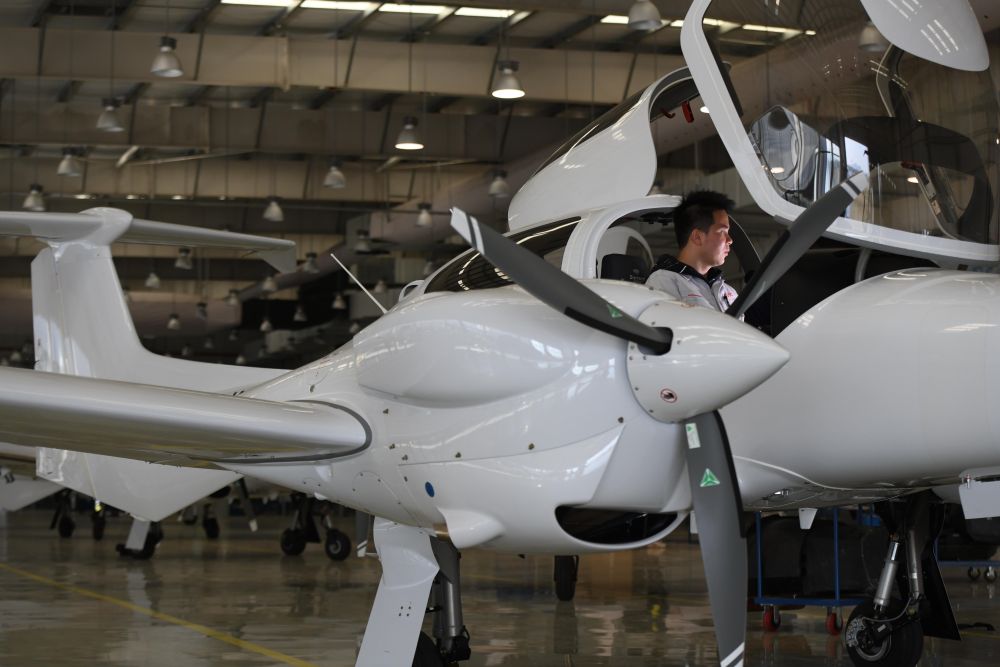 11月16日,在位于安徽省芜湖市湾沚区的中电科芜湖钻石飞机制造有限公司内,技术人员在进行飞机检测工作。