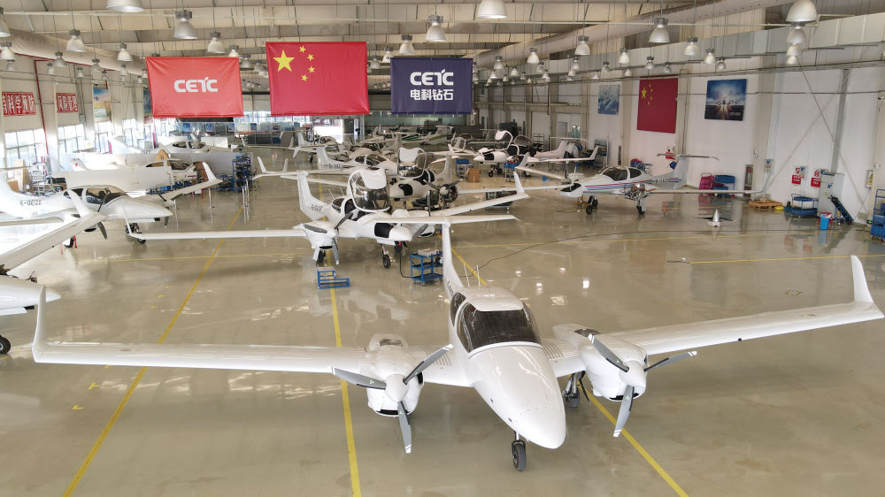 11月16日,在位于安徽省芜湖市湾沚区的中电科芜湖钻石飞机制造有限公司内,技术人员在进行飞机检测工作(无人机照片)。