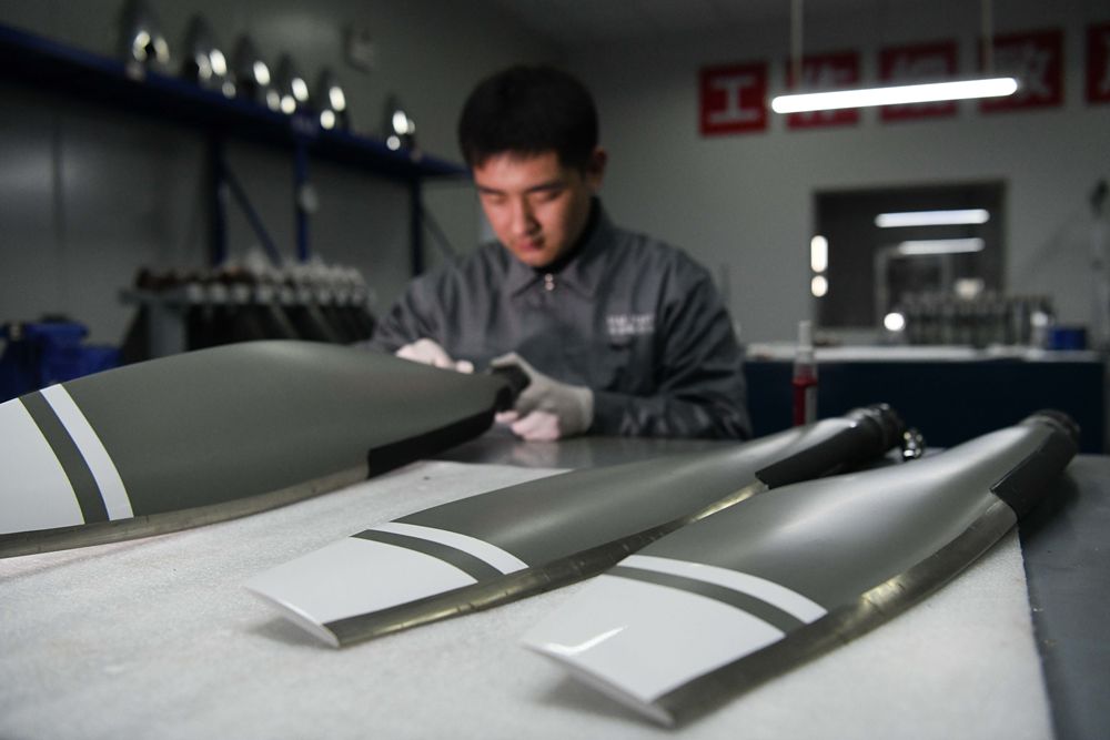 11月15日,在位于安徽省芜湖市湾沚区的安徽劲旋风航空科技有限公司内,技术人员在进行螺旋桨装配工作。