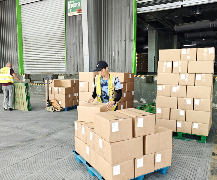 2025年9月4日,在三只松鼠(无为)健康食品城,工人正在卸货。新华网李东标 摄