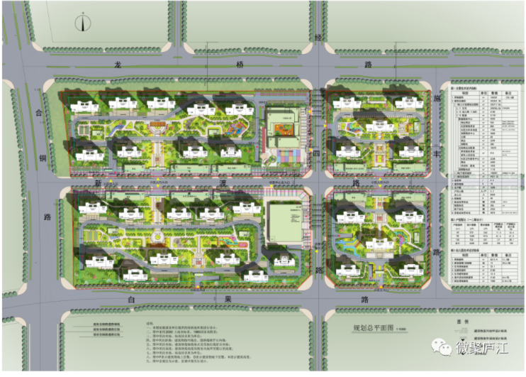 规划用地性质:居住用地;规划总用地面积150331㎡,总建筑面积443331.38㎡(其中地上建筑面积335244.38㎡,地下建筑面积108087㎡),共计五十栋单体,地上住宅二十至二十六层、公建一至四层,地下一层,包括三十栋住宅、十栋沿街商业及配套设施、六栋配电房、一栋配套服务中心、一座十二班幼儿园、四个地下车库。容积率2.2,建筑密度18%,绿地率40%。机动车停车位3258个,非机动车停车位3875个。