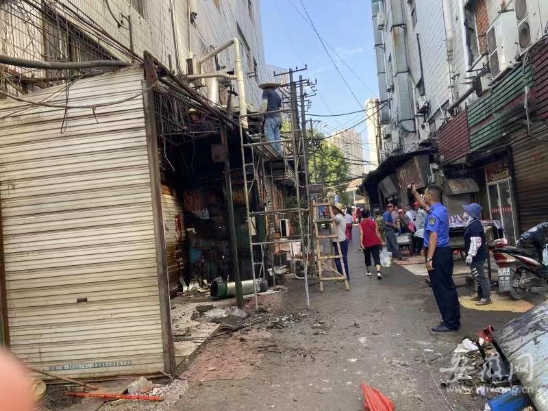 “金江小商品市场南侧小巷是金江苑小区及商场中间的消防通道,被擅自占用搭建了24间彩钢瓦结构的小商铺,违建面积约600平方米,用于经营童装等小商品,原本可供消防车辆通行的道路被挤占得只剩不到两米的距离,再加上两侧商户出店摆放,行人通行十分拥挤。而且由于搭建比较密集,且使用的建筑材料及店内堆放的货物均为易燃物品,存在一定安全隐患。”