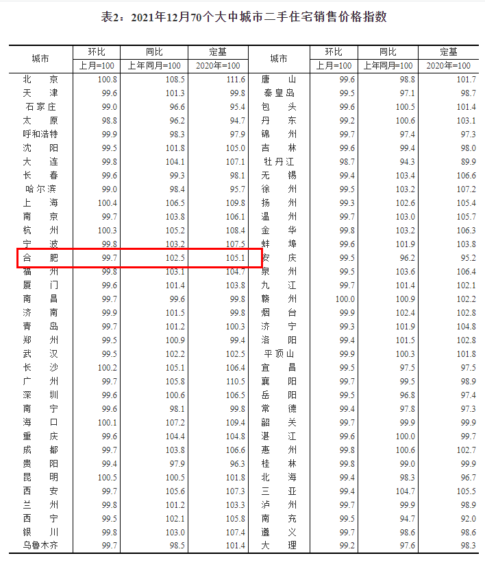 新安晚报 安徽网 大皖新闻讯 1月17日,记者从国家统计局了解到,该部门发布了2021年12月份70个大中城市商品住宅销售价格变动情况,合肥新建商品住宅销售价格指数环比上涨0.2%,同比上涨3.5%;合肥二手房销售价格环比下降0.3%,同比上涨2.5%。