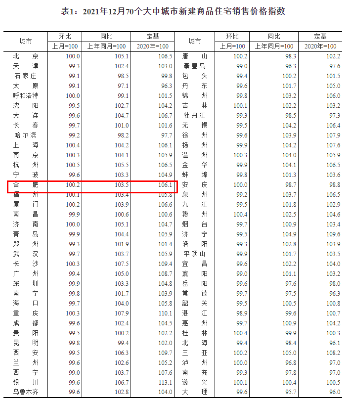 与2020年定基相比,2021年12月份合肥新建商品住宅销售价格指数涨幅为6.1%,与上海并列70个大中城市第18名。