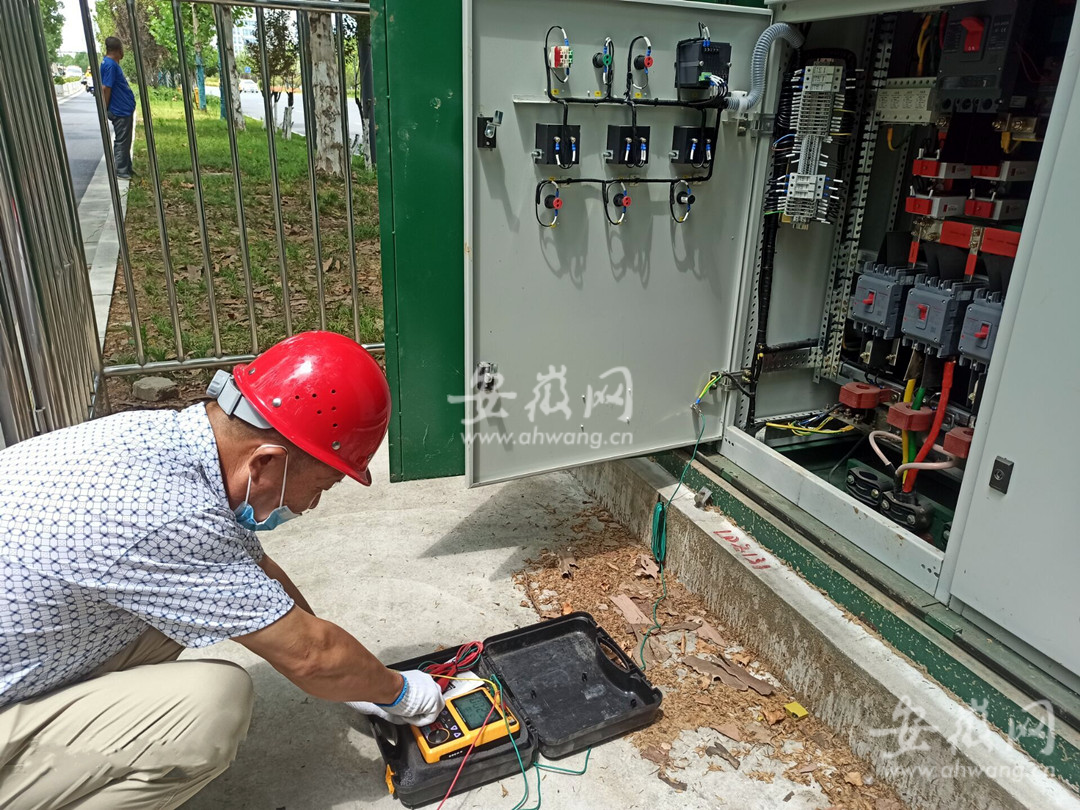 7月13日上午,在合肥翡翠湖风景区环翠路上,经开区公用事业公司的路灯维保人员正在调整公共照明控制柜内线路。现场工作人员表示,调整后,路灯正常亮灯,确保市民安全出行,但沿路的一道景观亮化带将被关闭,具体恢复时间根据上级调度。