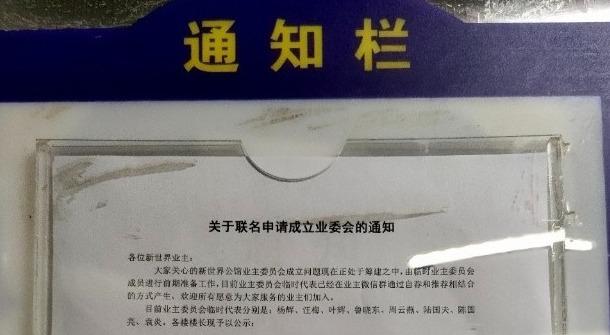 新世界公馆小区通知栏张贴‘’关于联名申请成立业委会的通知。