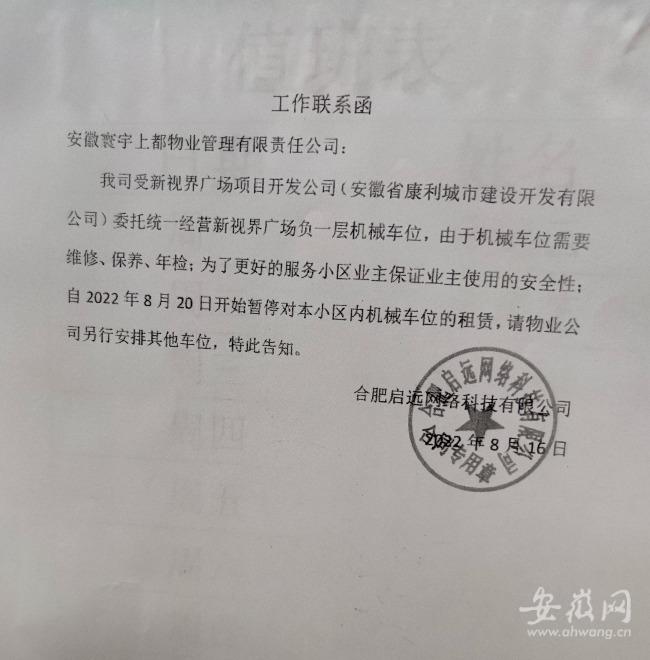 “让大家没想到的是,8月16日晚,合肥启远网络科技有限公司又向小区物业发了一封工作联系函,表示自8月20日开始暂停对本小区内机械车位的租赁。”樊女士说,开发商借维修保养、年检机械车位之名,行变相倒逼业主购买车位之实,“原本小区地面临时车位就少,现在又逼着租赁负一层机械车位的业主把车停放到地面临时车位,突然大量来来往往的车不仅无处停放,而且还会惊吓到小孩和老人,给居民生活带来极大不便。”