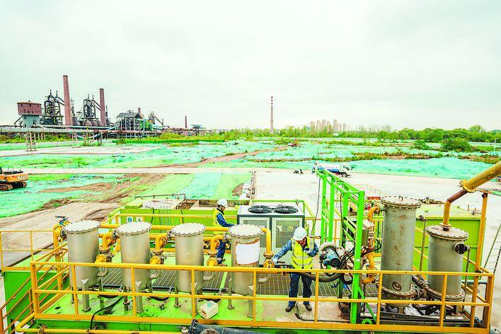 土壤修复中的马(合)钢地块,工作人员正在调试安装设备