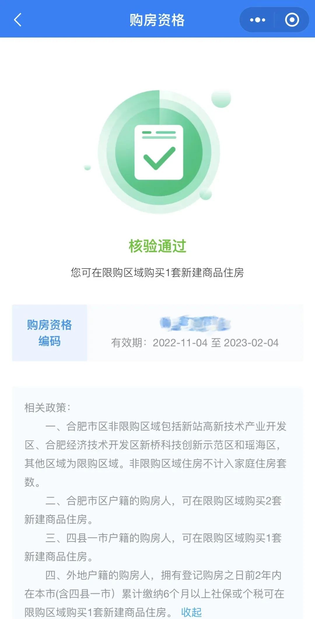 核验状态由“核验中”变为“通过”后,再点界面,可以看到审核结果。包括可购买的套数、有效期等。