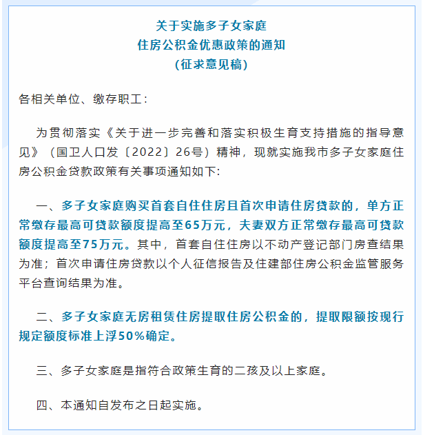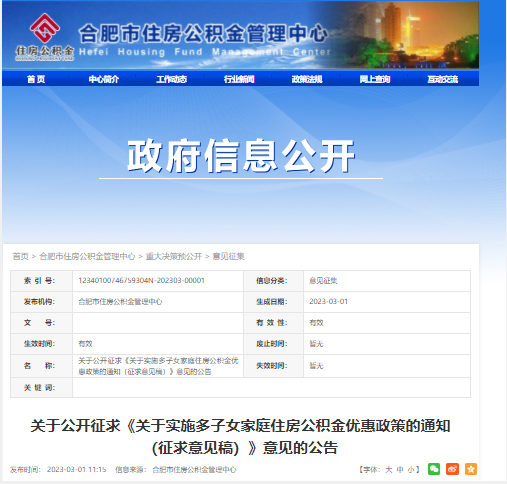 大皖新闻讯 据合肥市住房公积金管理中心3月1日消息 市公积金管理中心发布公开征求《关于实施多子女家庭住房公积金优惠政策的通知(征求意见稿)》意见的公告称,为贯彻落实《关于进一步完善和落实积极生育支持措施的指导意见》(国卫人口发〔2022〕26号)精神,加大对多子女家庭通过住房公积金解决基本住房问题的支持力度,现就《关于实施多子女家庭住房公积金优惠政策的通知(征求意见稿)》公开征求社会各界意见。