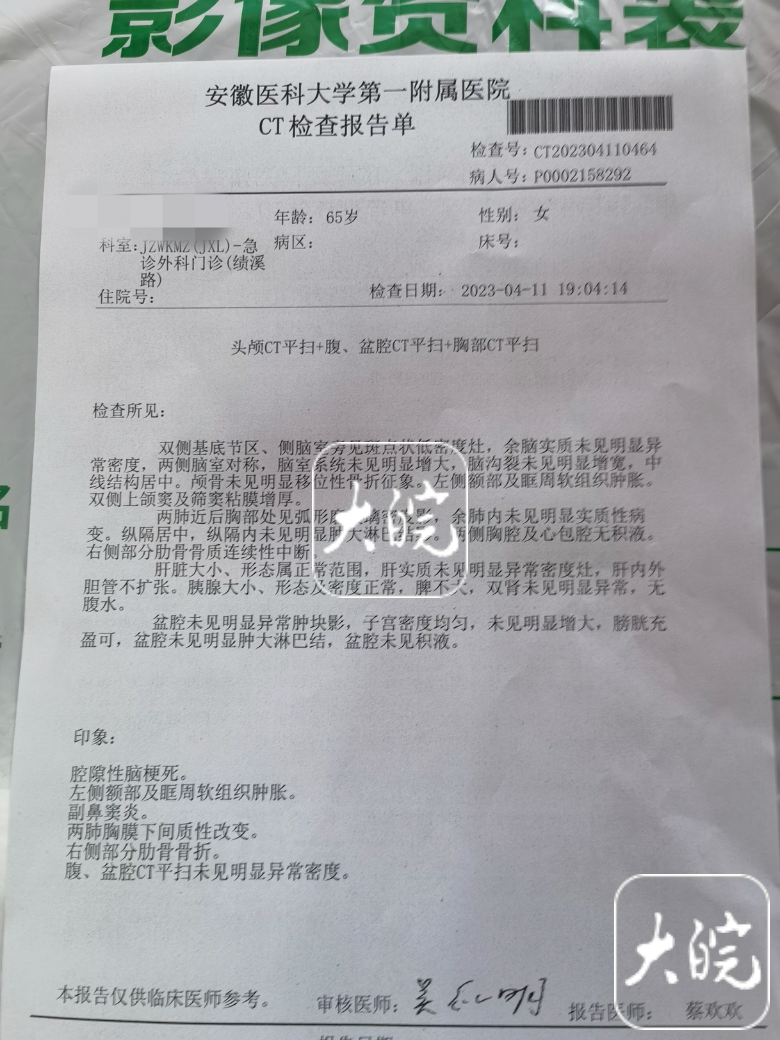 “我爱人都65岁了,她当时被砸倒在地就晕过去了,出了好多血,后来她醒来强撑着爬起来拿到手机找到物业,物业才打的急救电话。”巴先生在接受大皖新闻记者采访时表示,其妻子大腿骨折,肋骨、额头以及眼部等多个部位受伤严重,已经在医院动了手术,“我爱人这么大年龄了,还遭这样的罪,实在太难受了。”