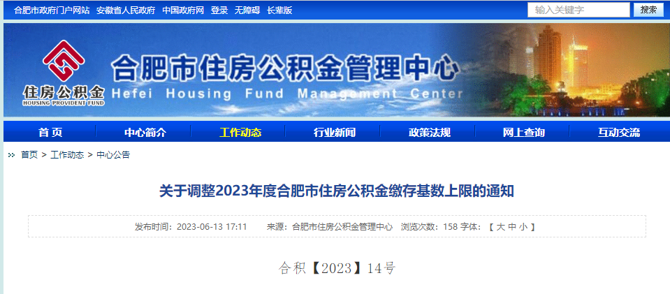 大皖新闻讯 6月13日,合肥市住房公积金管理中心发布《关于调整2023年度合肥市住房公积金缴存基数上限的通知》,具体如下: