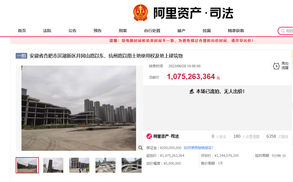 6月28日,阿里资产司法拍卖平台显示,合肥市滨湖新区华山路以西、南宁路以北土地使用权项目已流拍。该标的获得11796次围观、262人提醒、0人报名、0次出价。同一天,合肥宝能城的MALL及酒店部分流拍,起拍价约10.75亿元。此次共获得6358次围观、180人提醒、0人报名、0次出价。