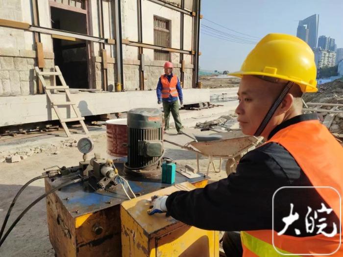 20日上午8时40分,大皖新闻记者来到平移现场,此时,多名工人已就位,穿戴整齐,蓄势待发。据工程监理人员向栋介绍,该平移项目采用PLC电脑同步平移控制系统顶推施工,通过千斤顶靠背,将四个千斤顶的传感力传向控制台,同时产生的作用力将建筑物向前推进。