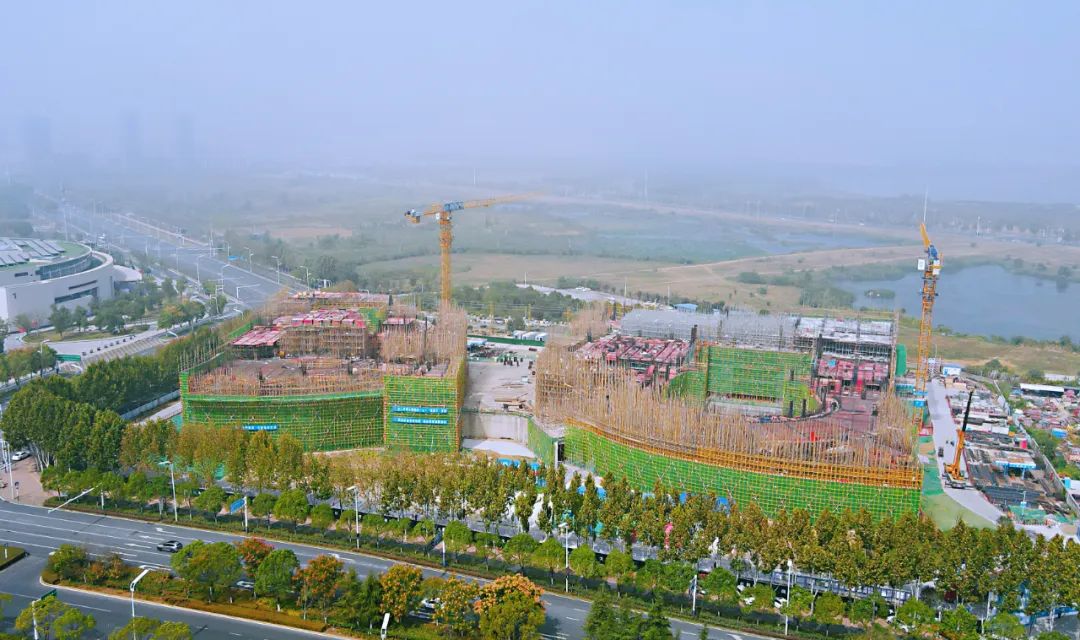 9月29日上午,位于滨湖新区 环湖北路与云谷路交口东北角的安徽百戏城项目,现场一派热火朝天的施工场景。