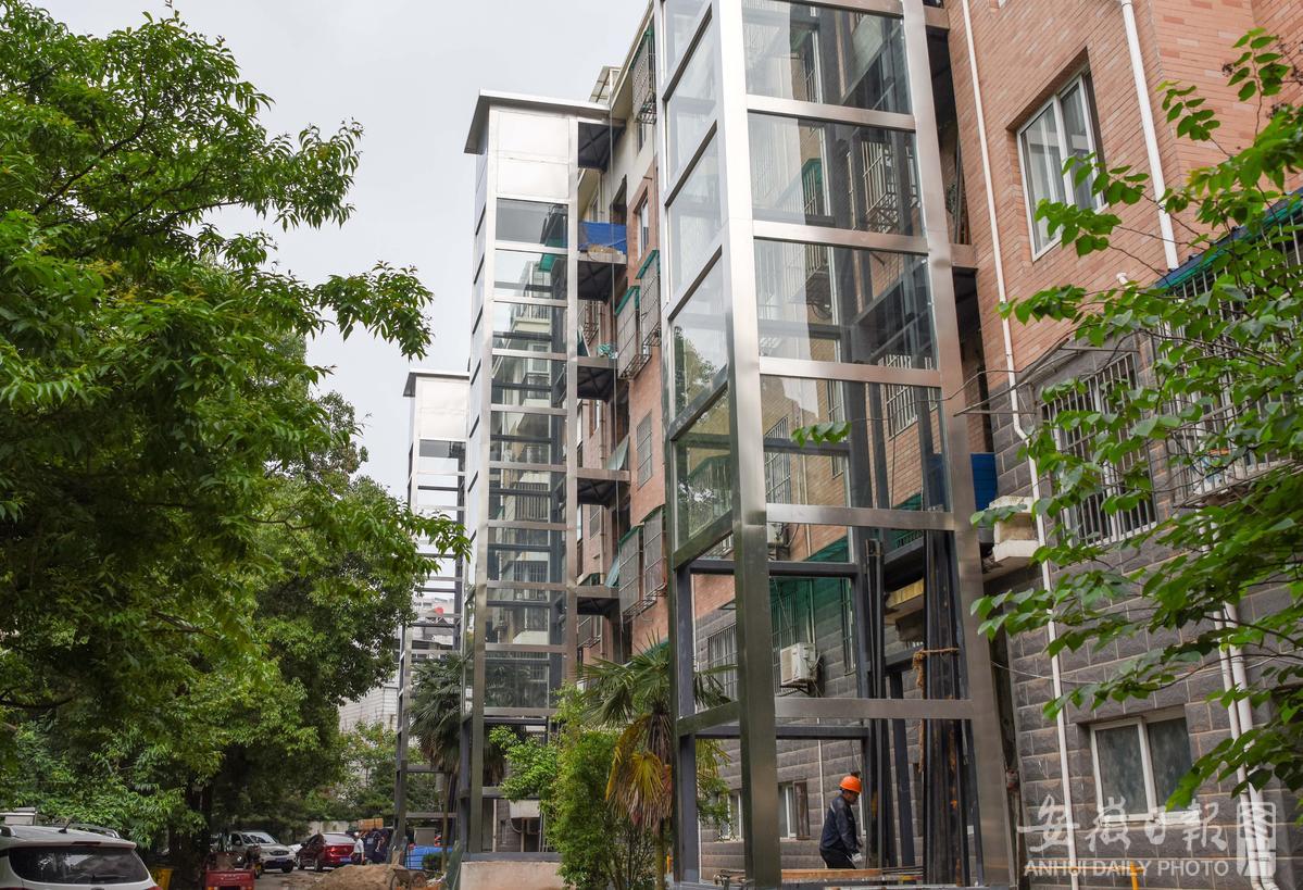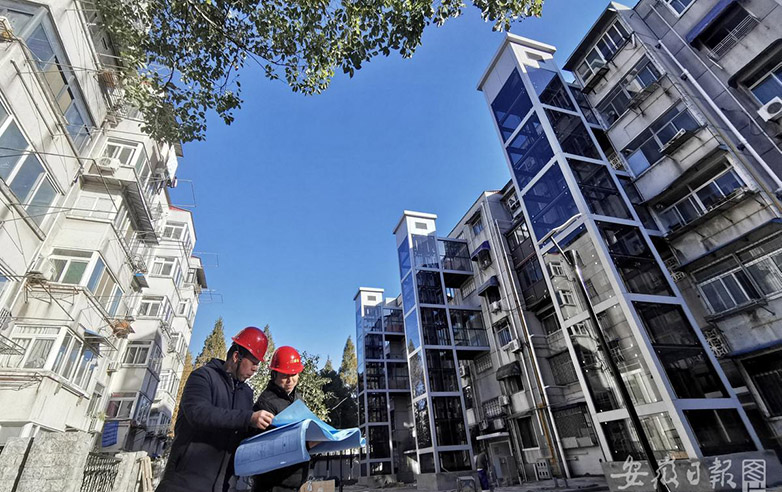 11月23日,合肥市蜀山区陈村路社区一老旧小区正在改造加装电梯。
