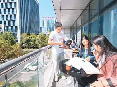 在德清地理信息小镇,浙江国遥地理信息技术有限公司员工在茶歇时间沟通项目进度。