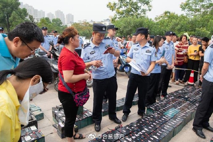 据@合肥警方消息,8月31日上午,由合肥市公安局视频侦查支队牵头,@瑶海公安 @新站公安 在瑶海区龙岗游园集中返还了上百辆被盗电动车、数百块被盗电瓶。这是全市首场“被盗三车、电动车电瓶集中返还活动”,展示了公安机关坚决打击各类违法犯罪,特别是打击盗窃“三车”、电动车电瓶等“苍蝇式”违法犯罪的决心。