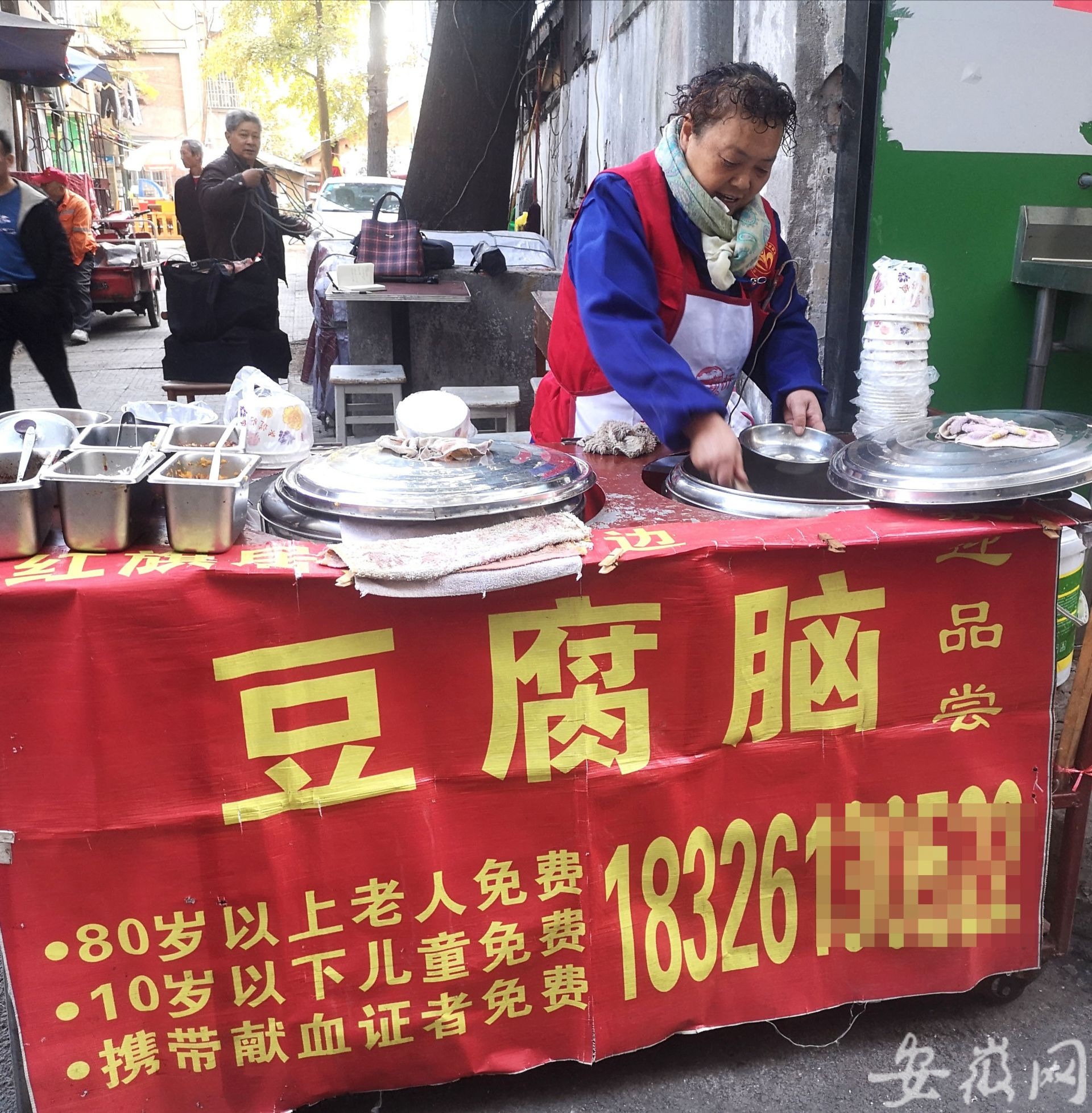 梨花巷是合肥一条著名的小吃街巷,里面有各色小吃。蒋同扣的豆腐脑摊在这里并不起眼,却很特别。长约2米的手推车挂着一个红色条幅,上面写着:80岁以上老人免费 10岁以下儿童免费 携带献血证者免费。