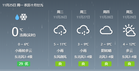 (合肥市气象台2019年11月25日06时发布)今天白天:阴天有小雨。偏北风4级,阵风7-8级。最高气温:7℃。今天夜里:阴天到多云。东北风3级。最低气温:2℃。预计:26号,阴天有小雨。