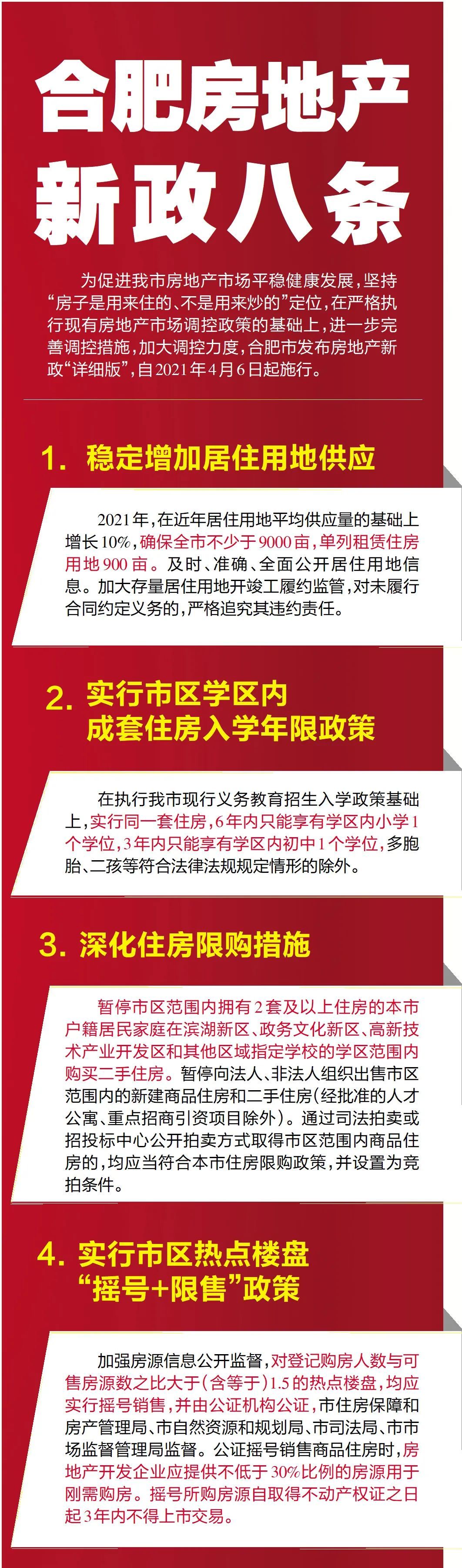 合肥市发布房地产“新政八条”,涵盖学位制、二手住房限购、热点楼盘“摇号+限售”等八个方面。新政自2021年4月6日起施行。
