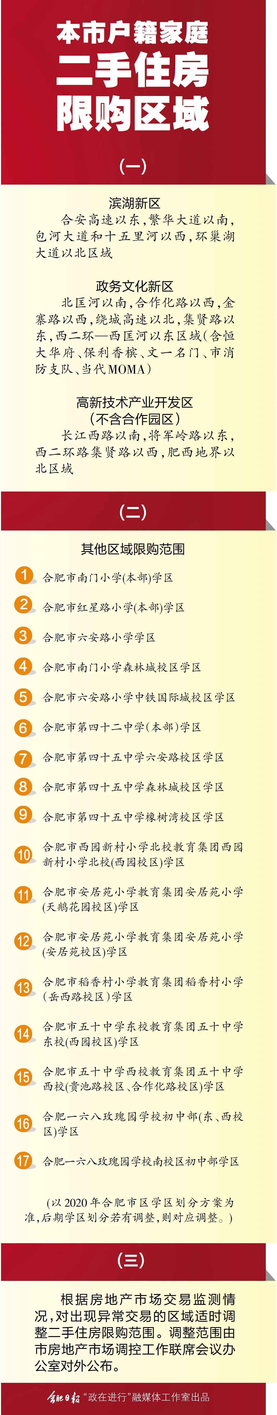 为精准打击部分区域二手住房和学区房炒作行为,在严格执行《关于进一步促进我市房地产市场平稳健康发展的若干意见的通知》(合政办〔2016〕43号)的基础上,进一步收紧我市部分区域二手住房限购政策,即暂停市区范围内拥有2套及以上住房的本市户籍居民家庭在滨湖新区、政务文化新区、高新技术产业开发区和其他区域指定学校的学区范围内购买二手住房。其中,学区范围以2020年教育主管部门学区划分方案为准,后期学区划分若有调整,则限购范围对应调整。