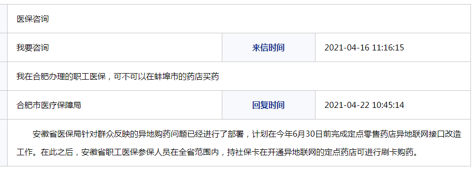 4月22日,合肥市医疗保障局回复时表示,安徽省医保局针对群众反映的异地购药问题已经进行了部署,计划在今年6月30日前完成定点零售药店异地联网接口改造工作。在此之后,安徽省职工医保参保人员在全省范围内,持社保卡在开通异地联网的定点药店可进行刷卡购药。