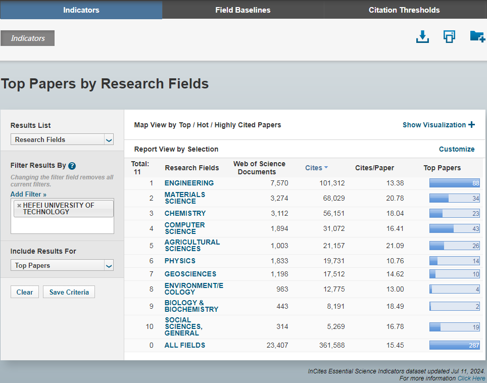 目前,合工大进入ESI前1%的学科分别是工程学、材料科学、化学、计算机科学、地球科学 、农业科学、环境学/生态学、社会科学总论、生物学与生物化学、物理学。其中,工程学学科进入ESI全球前1‰。