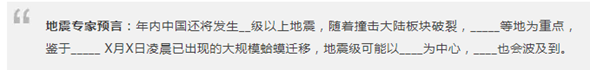 地球板块在不停的运动,相互之间会发生碰撞、挤压、拉伸,肯定会有发生破裂的地方,单靠这点无法成为准确预测地震的指标。凡预测某次地震震级、发震时间、发震地点都很准确者都可判定为虚假消息。因为地震预测在全世界都是个难题,目前尚处于探索阶段,我国的短期、临震期地震预测水平仍然很低。下图是几种常见的地震谣言,大家可以看下真相解读。
