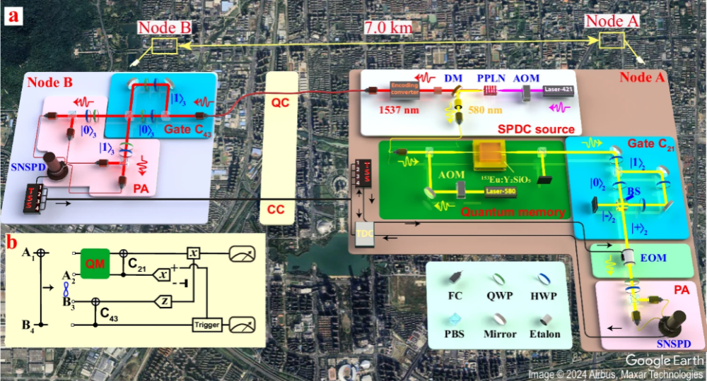 近期,郭光灿院士团队基于量子门隐形传送协议,建立两个量子节点之间的非局域量子门,这两个量子节点分别位于中国科学技术大学东校区和合肥市大蜀山东侧,之间的直线距离为7公里。