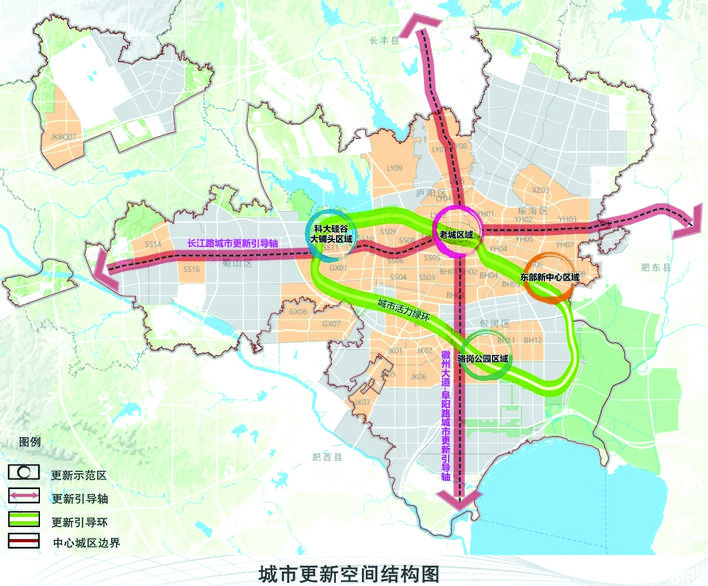记者了解到,合肥拟落实国土空间总体规划“1412”中心体系,以重塑城市功能为重要任务,构建“一环引领、十字联动、四核示范、多片协同”城市更新总体空间结构。
