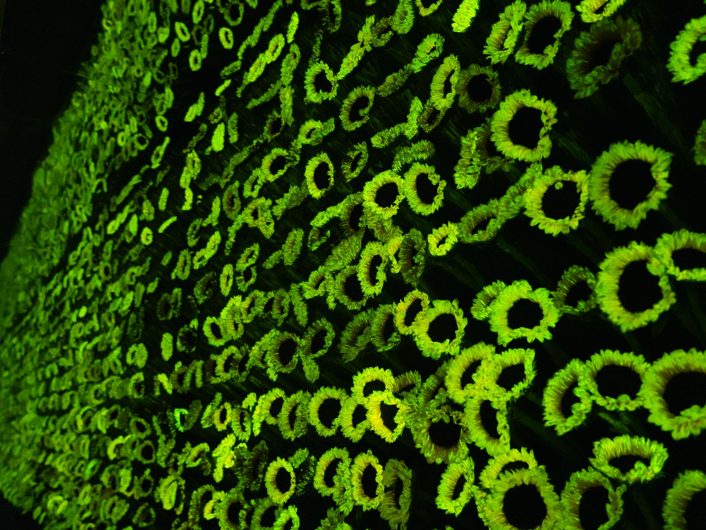 站在青岛海底世界的“荧光星河瀑布”前,观众们被梦幻的一幕震撼:在高达9.5米、宽逾10米的户外崖壁上,发光菌随水流倾泻而下,勾勒出璀璨流动的绿色星河;室内展区的“气泡柱”装置则让游客通过触摸开关唤醒菌群发光,带来奇妙互动体验。这标志着神笔生物的生物发光技术从实验室迈向公众体验的重要突破,也成为神笔生物技术应用的成功典范。