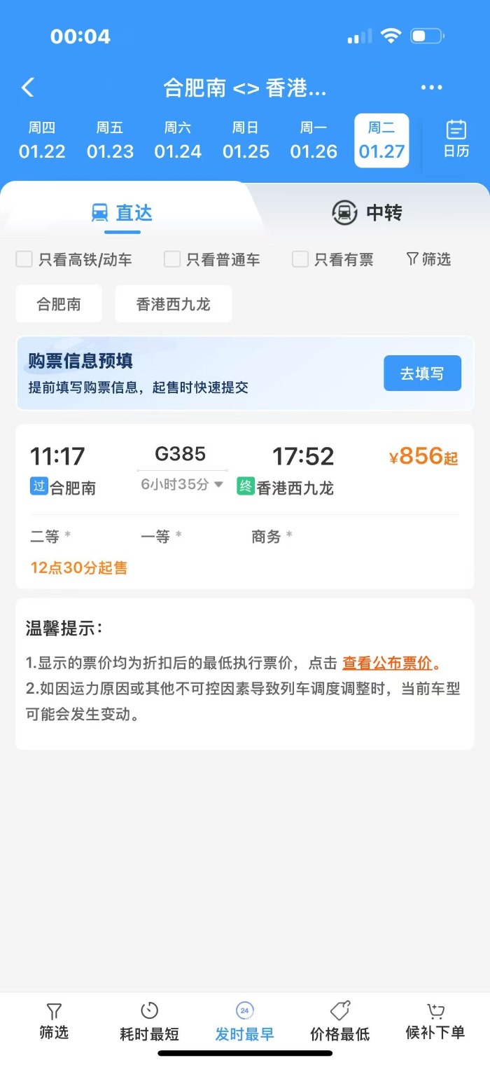 一天后,记者查询铁路12306发现,合肥南站至香港西九龙站的高铁车票也正式开售,最早班次则是1月27日。从合肥南站发车时间是11点17分,经过6小时35分后,于17点52分抵达香港。