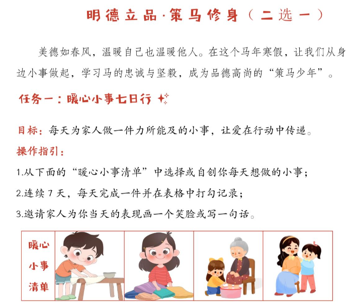 西园新村小学南校的寒假实践手册藏着满满的温度,六大板块涵盖暖心寄语、安全提示和一系列趣味任务。“连续7天为家人做力所能及的小事,还要让家人写反馈”,这一任务让该校中年级学生妍妍格外期待。“我每天要帮妈妈摆碗筷、给爸爸捶背,妈妈说要把我的表现记下来贴在冰箱上呢!”妍妍兴奋地规划着。手册中还收录了马年相关的成语故事、古文和动画。“这些故事里马儿的忠诚和坚持,会变成孩子们成长的力量。”该校老师介绍道。此外,学唱“马主题”歌曲、绘制骏马画作、跟着视频做科学实验等任务,让寒假作业像探险一样充满乐趣。“唱歌不是我的强项,我想让爸爸陪我一起学,这样就不怕跑调啦!”妍妍俏皮地说道。