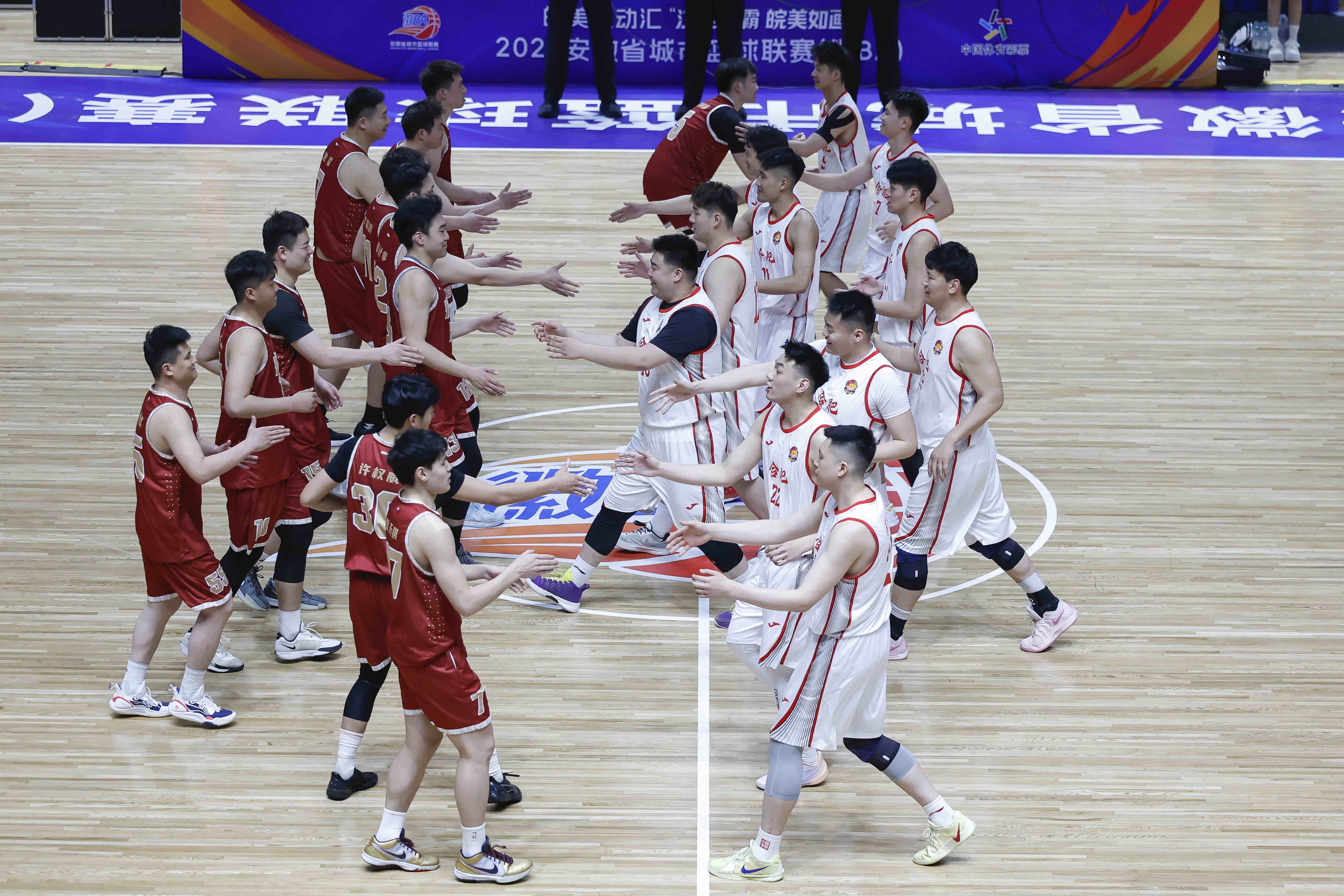 4月11日晚,“徽BA”揭幕战在安徽省体育馆热力启幕,赛前合肥队和宿州队队员相互致意。