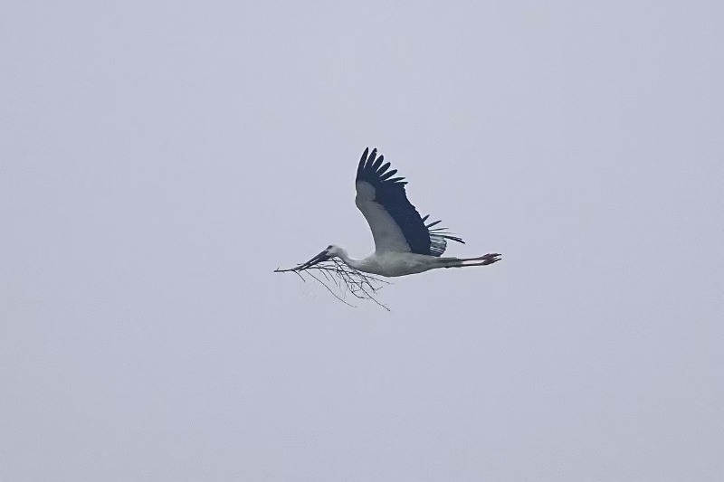 图为1月28日,何斌记录下东方白鹳衔枝飞翔的场景