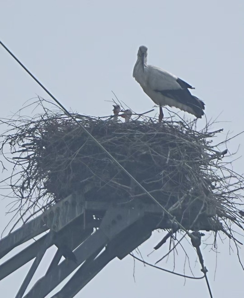 随着春季来临,候鸟北归,唯独这对东方白鹳仍执着留守,不断有监测人员在湿地内目击到它们。功夫不负有心人,4月15日,何斌终于在湿地一处高压塔顶端锁定了这对“夫妇”的新家,通过镜头可见,巢中已有幼鸟破壳而出,有两只幼鸟在巢内。虞磊根据照片初步判断这些幼鸟至少已有两周大,由于照片角度受限,具体幼鸟数量尚待进一步确认。