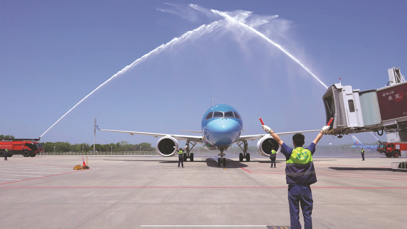 4月26日12:00,一架南航C919型“大美湾区”号彩绘飞机平稳降落在合肥新桥国际机场。这是合肥新桥国际机场首次运营由国产大飞机执飞的客运航班,实现了安徽旅客在家门口搭乘国产大飞机出行的心愿。为庆祝国产大飞机首次在合肥机场执飞商业航班,合肥新桥国际机场特意举行了民航界最高礼遇的“水门仪式”,迎接远道而来的国产大飞机。