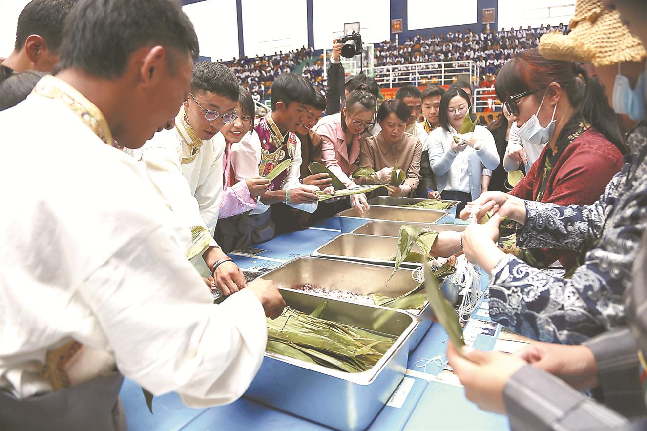 安徽援藏人员和山南二高师生一起包粽子。