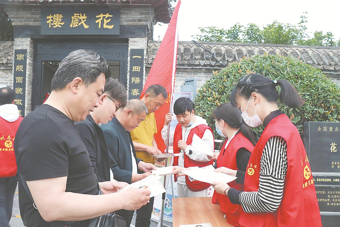 日前,在亳州市花戏楼景区广场,花戏楼社区组织党员志愿者向游客发放安全文明旅游指南,现场接受游客询问,倡导安全文明旅游。