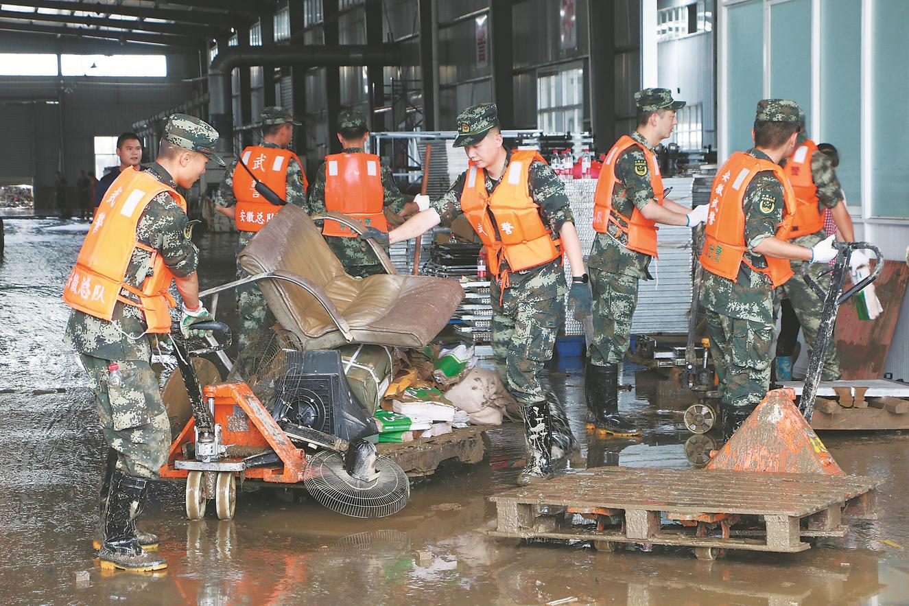 7月11日,武警官兵在歙县经济开发区一家汽车部件企业厂区内进行清淤作业,助力复工复产。 本网通讯员 余勇 本网记者 潘成 摄