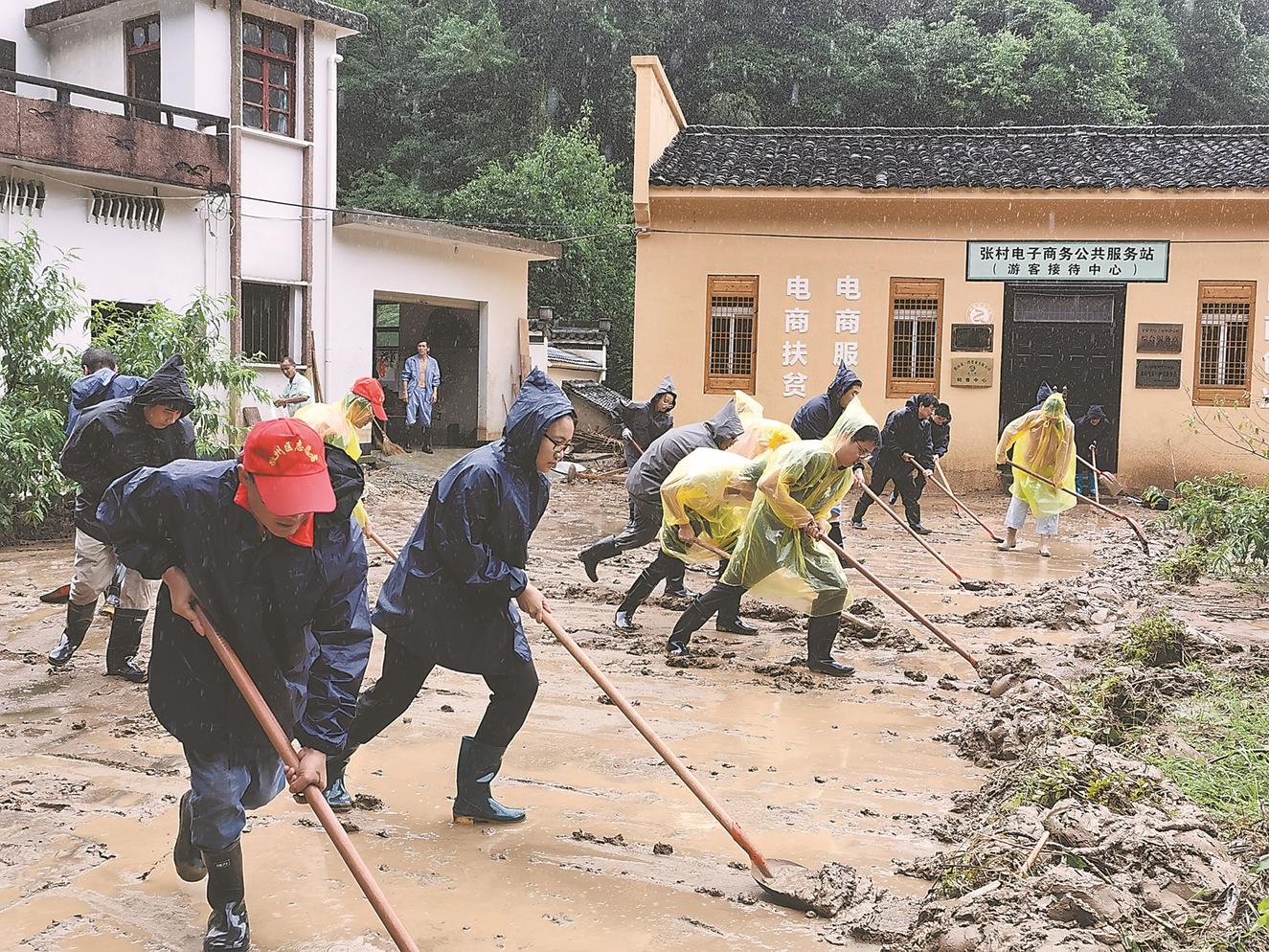 7月10日,黄山市徽州区党员干部在洽舍乡张村清理道路淤泥。连日来,该区广大干部群众迅速行动,全力修复水毁道路和农村供水供电等设施,恢复生产生活。 本网记者 潘成 本网通讯员 闫艳 摄