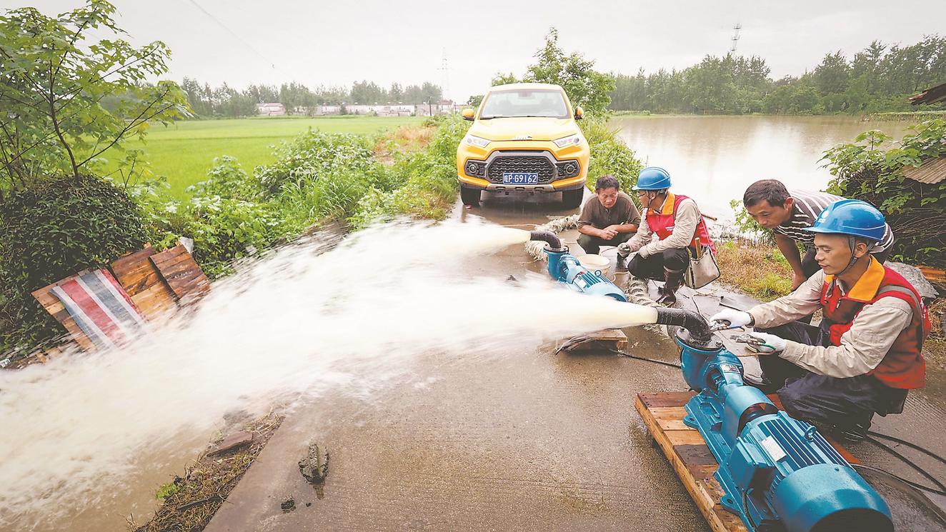 7月12日,泾县供电部门为琴溪镇玲芝村安装抽水机,给被淹的农田、果园、蔬菜大棚排水,以便农户尽快恢复生产。 特约摄影 李晓红 本网通讯员 韦振 摄