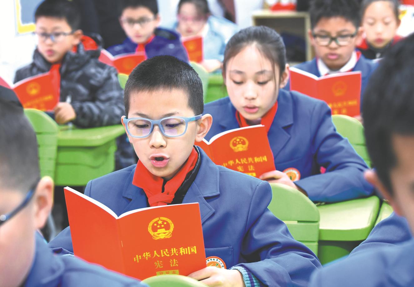 12月4日是全国第7个国家宪法日。12月2日,合肥市瑶海区蚌埠路二小学生在志愿者的引导下,在课堂上以趣味多样的形式学习宪法。 本网记者 杨竹 摄