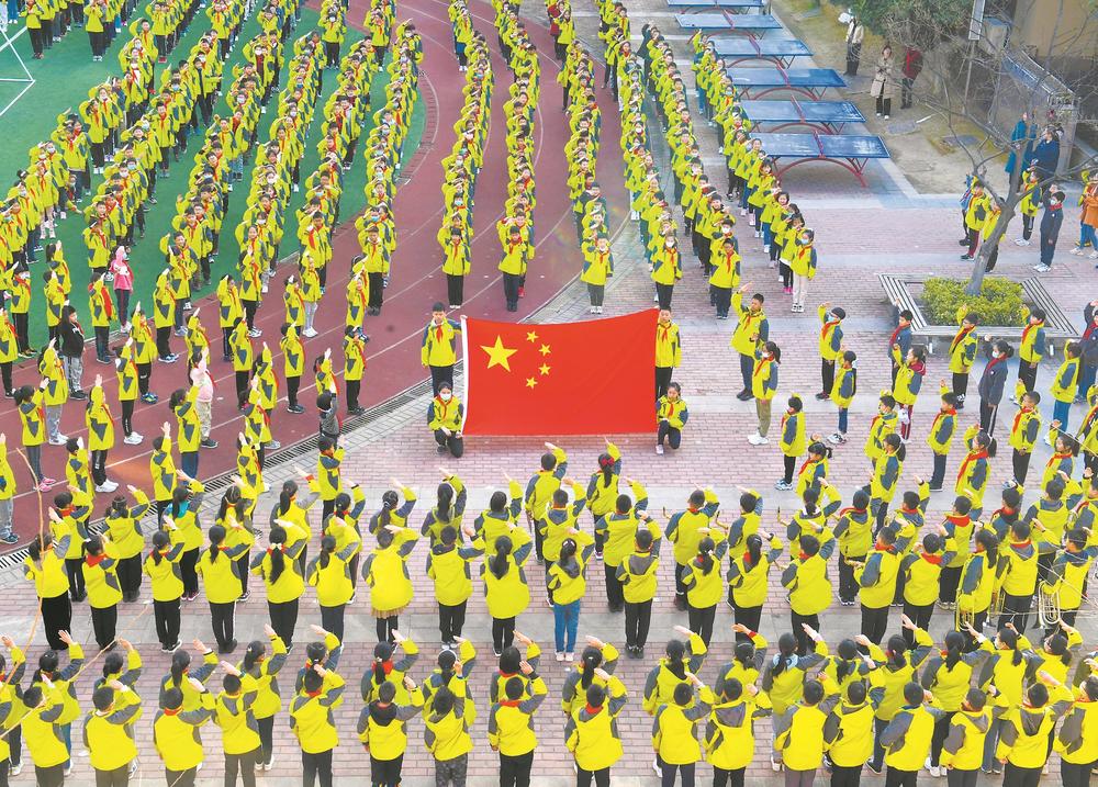 2月22日,合肥市习友路小学校园内,学生们集体向国旗敬礼,接受爱国主义教育,感受爱党爱国爱家乡的浓厚氛围。当日是合肥市中小学生开学首日,各学校在保证安全、防疫的前提下,开展多种多样的开学第一课。 本网记者 杨竹 摄