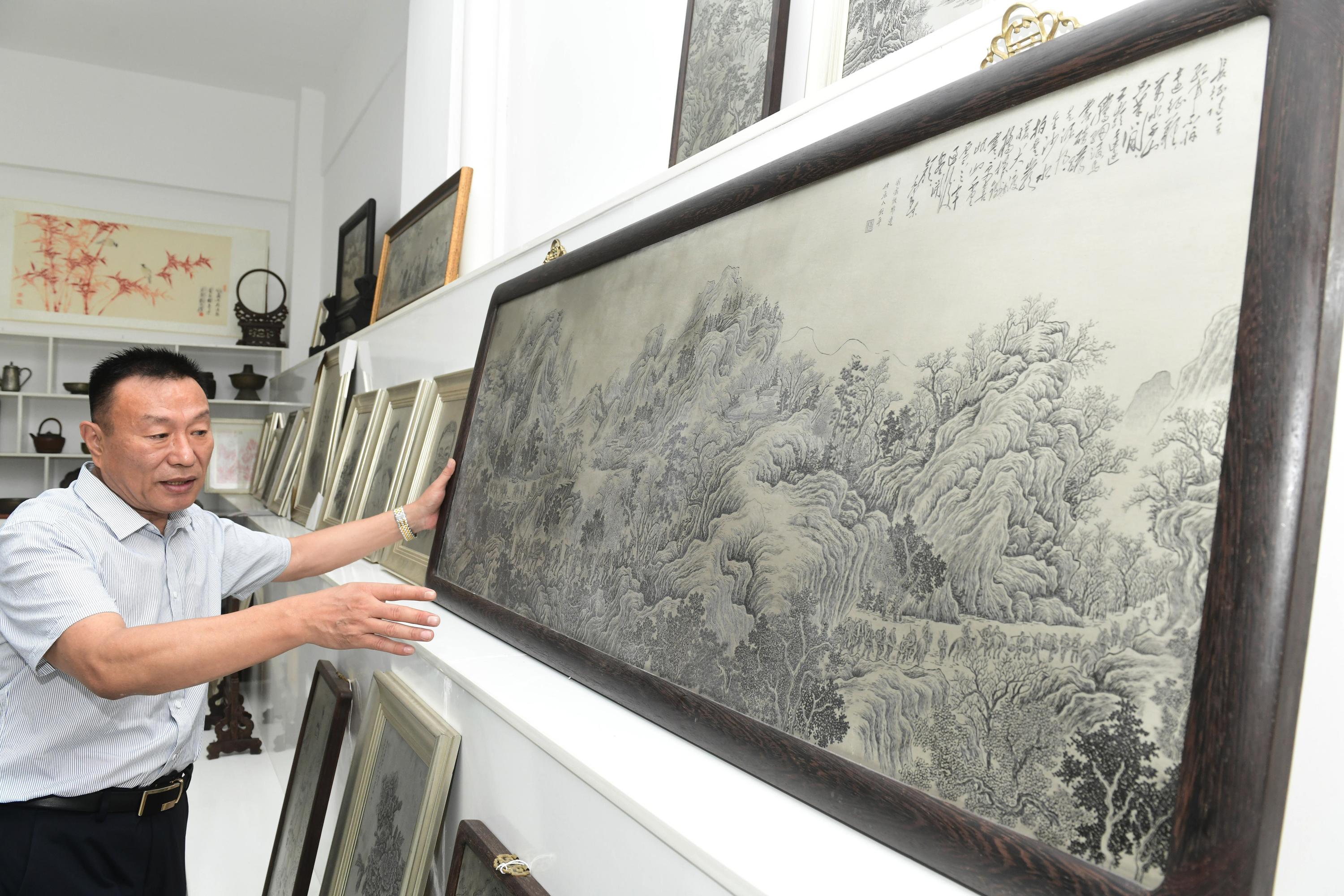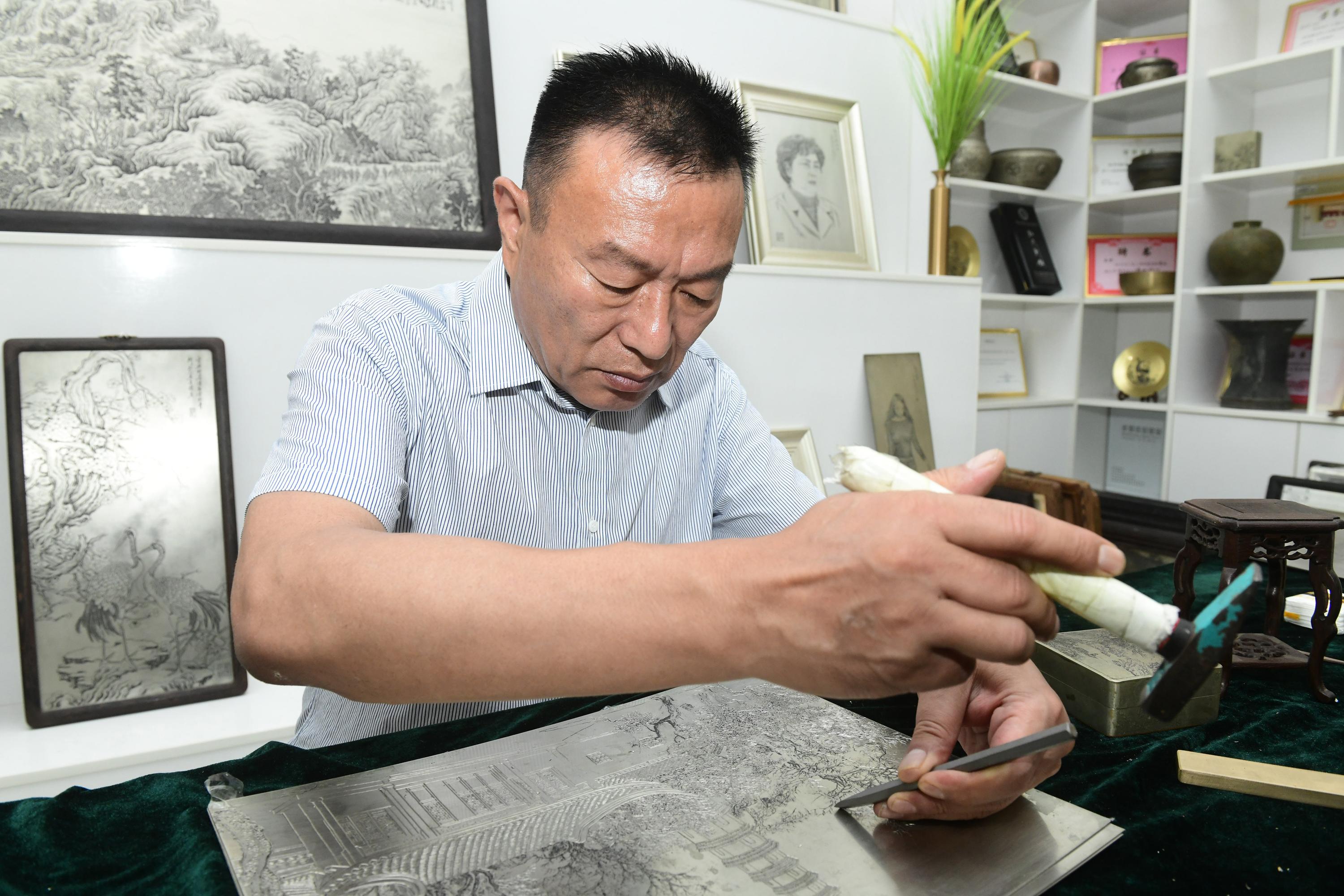 6月28日,阜阳市国家级非遗传承人杜平,在他的工作室内向前来参观的游客展示其创作完成的《长征》刻铜作品。